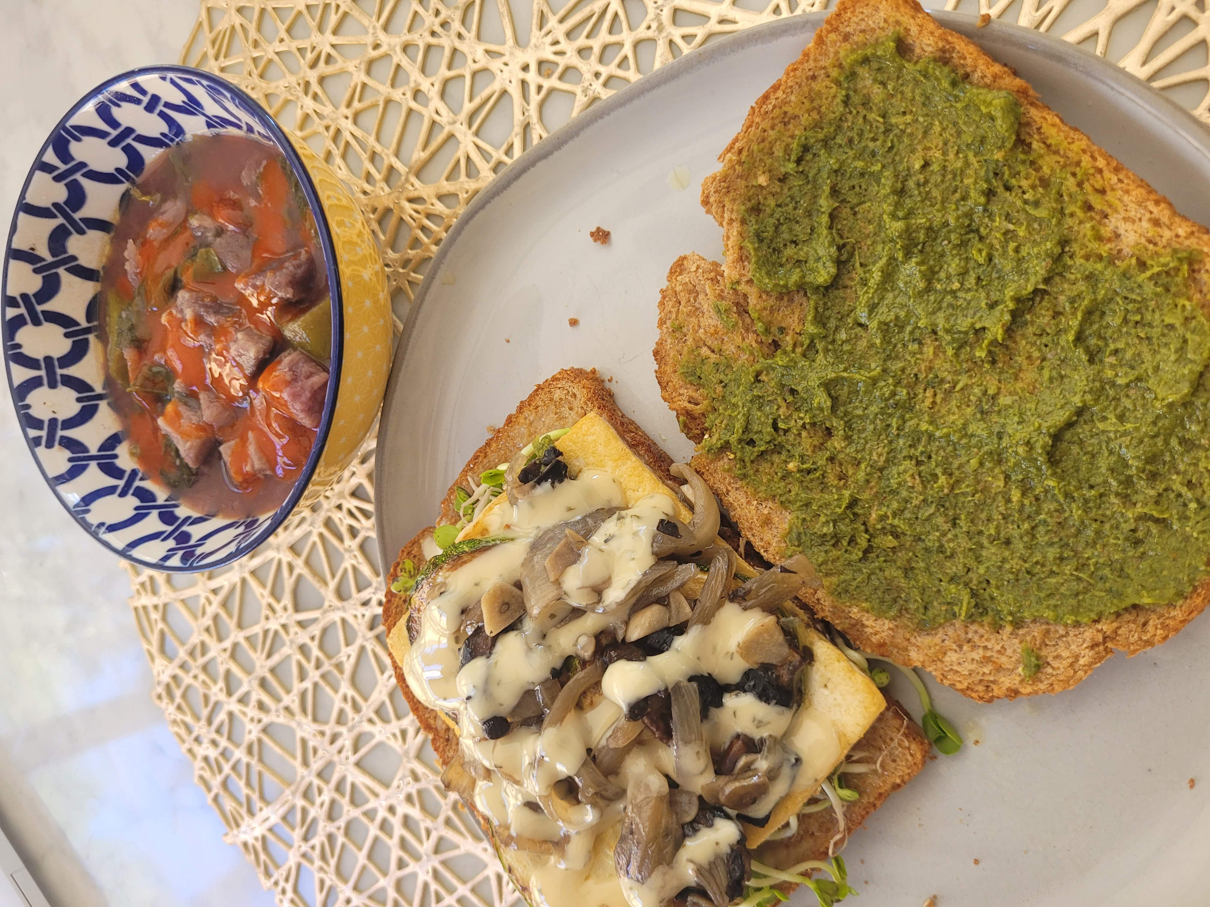 Here's one more sandwich I did actually remember to photograph before stuffing my face. Plated next to a delicious bowl of Josh Spodek's famous No Packaging Vegetable Stew. This sandwich had tofu, grilled mushrooms and onions, sprouts, and pesto + garlic sauce.