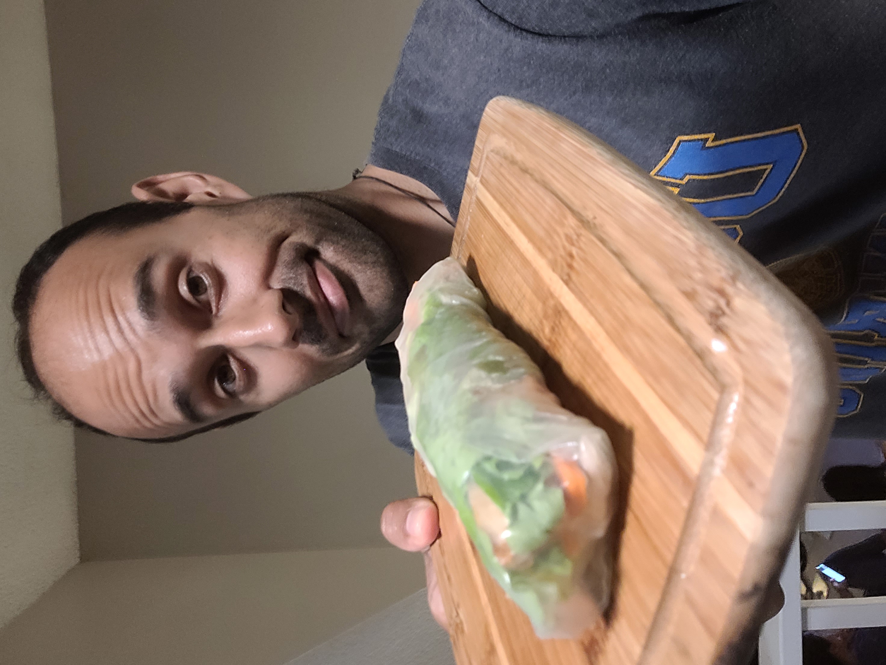 The next hard part was wrapping. To get that perfectly taut, tightly wrapped spring roll was surprisingly difficult. The rice paper is sticky and sticks to your hands, the surface you're working on, and to itself. That meant trying to apply enough pressure so that you don't rip the rice paper but still compact the veggies down while also trying not to let the rice paper touch any surfaces you didn't want was a challenge, but after about 10-15 rolls, I started to get it down. They never got as pretty as the ones at a restaurant, but they were edible.