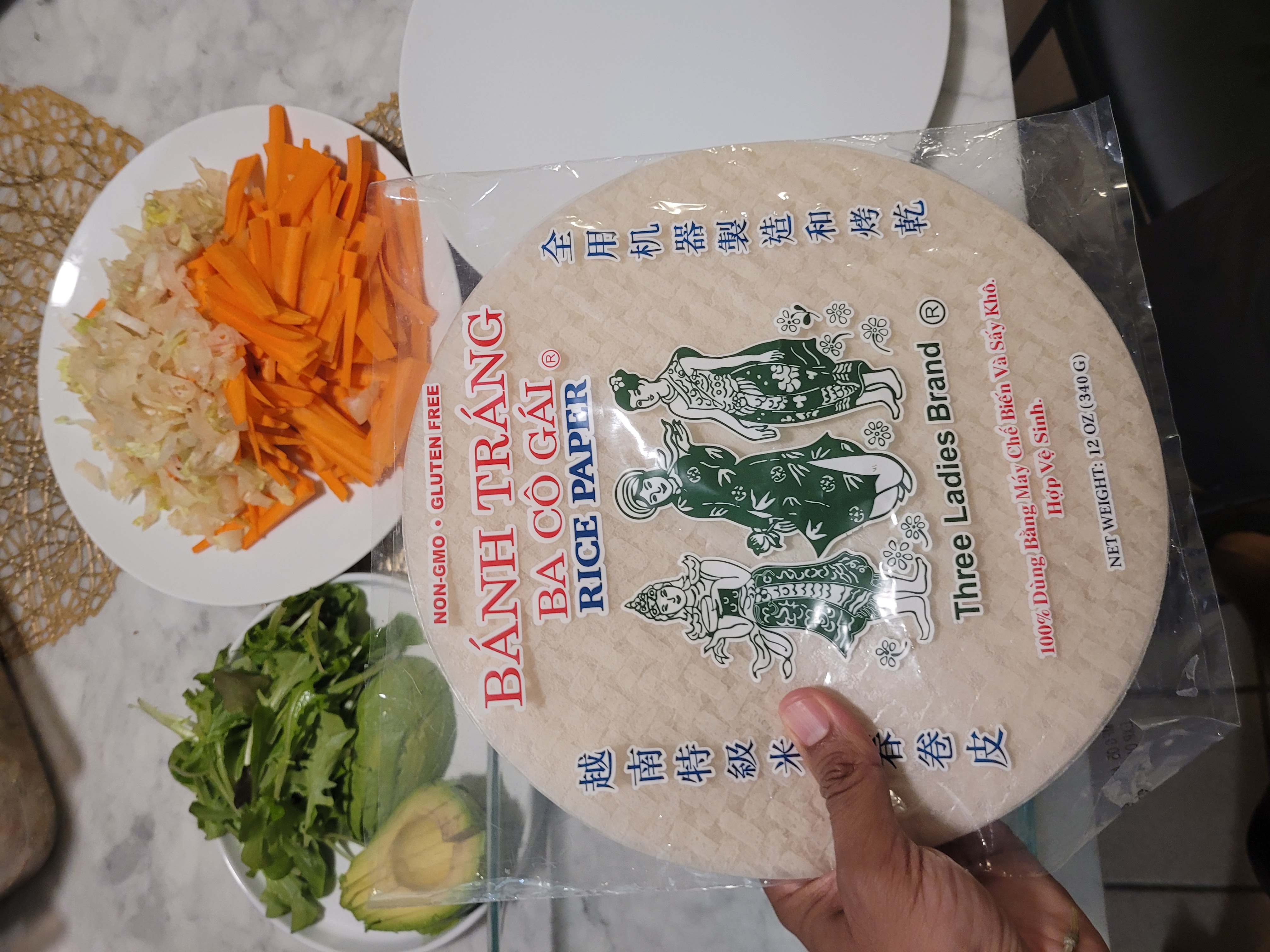 Digging through my kitchen cabinets, I came across the perfect candidate: rice paper! On a past visit to Hawaii, my mom had bought the rice paper to make some spring rolls, and it had been sitting in our kitchen cabinet ever since, so I decided why not make use of them? I knew rolling spring rolls was going to be something new for me, and it felt like something I could make with things I already had in the fridge, so I set to work!