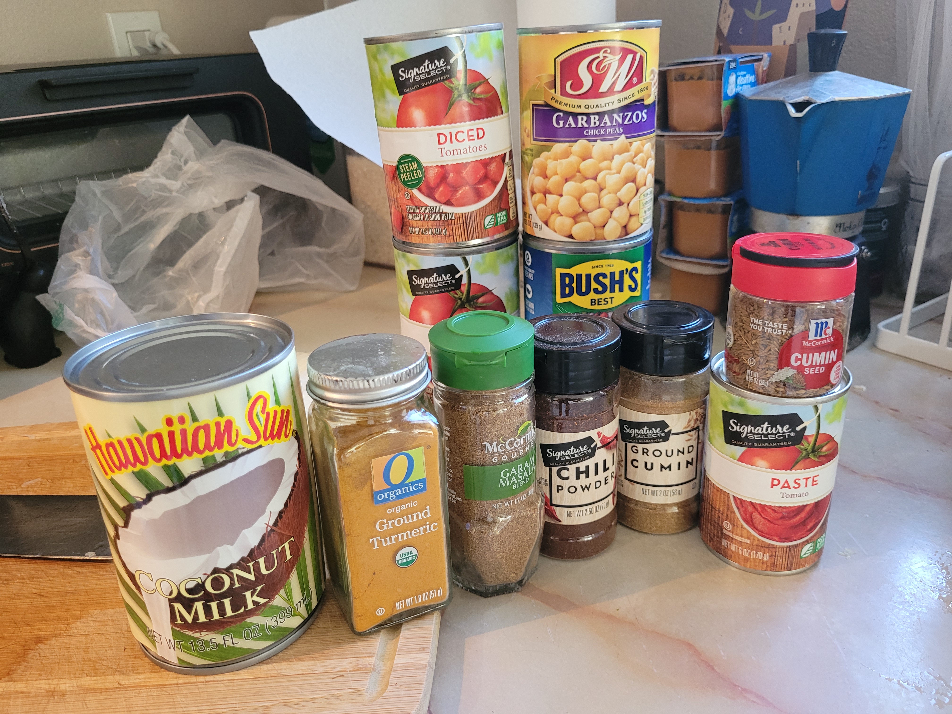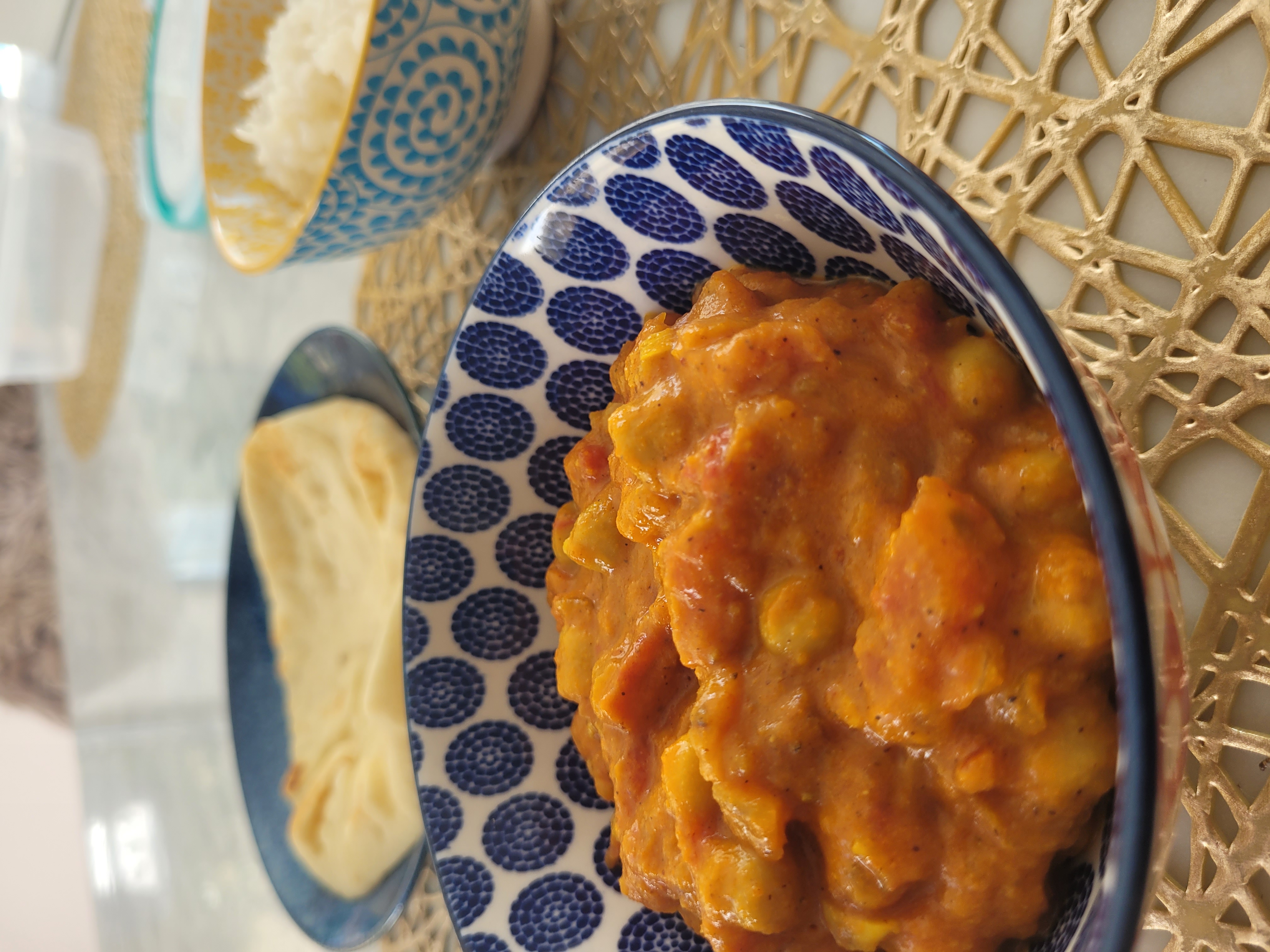 There were also some refinements I want to make, which I'll explain below: another onion, blend the onion and spices before adding tomatoes/tomato paste/chickpeas/milk, drain some of the tomato water, and add some honey or sugar.